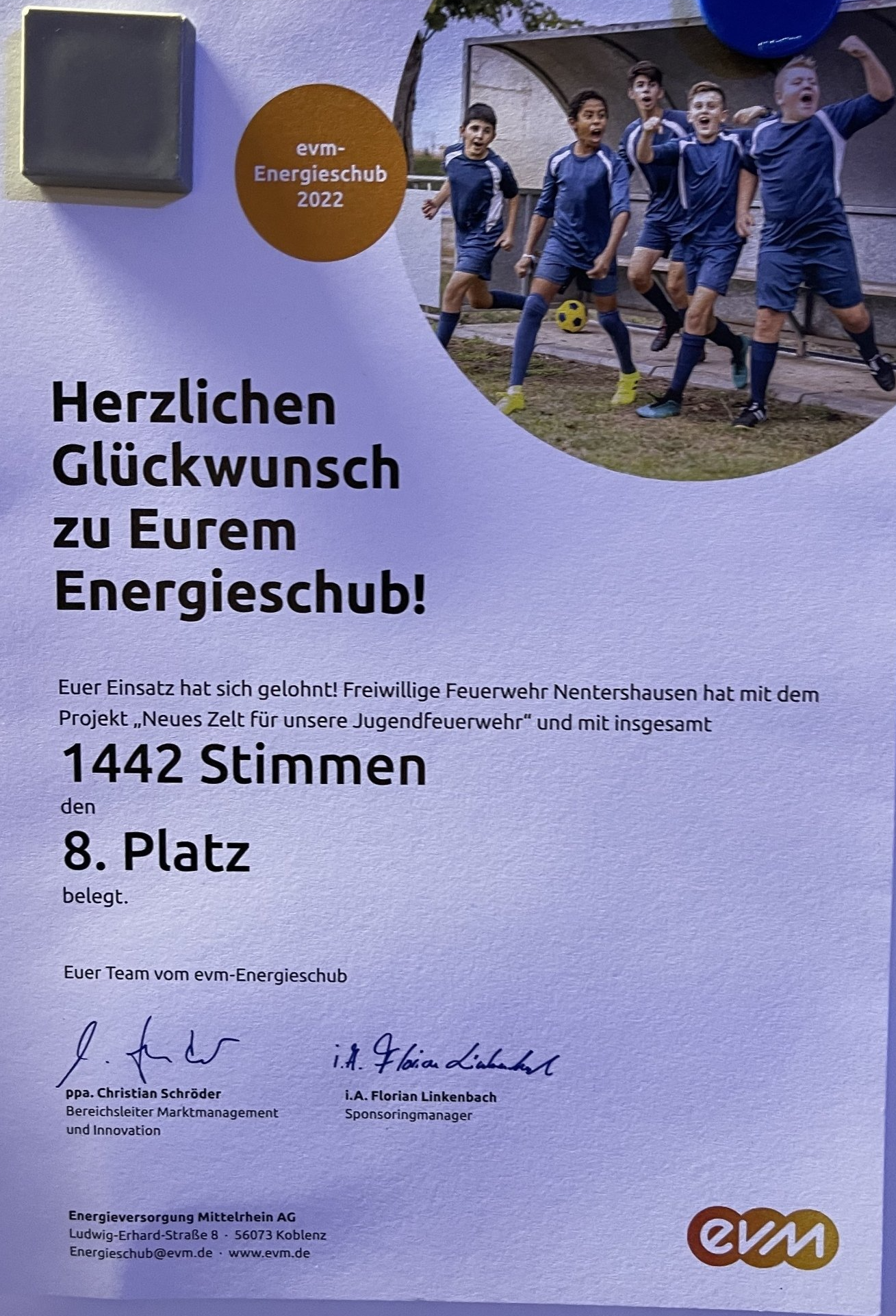 Die Jugendfeuerwehr hat mit dem Projekt neues Zelt beim evm-Energieschub den 8 Platz belegt.